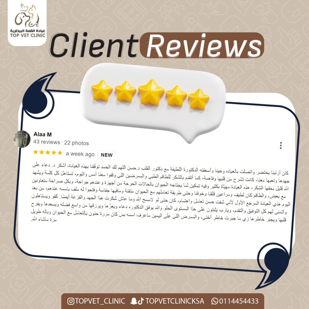 نحن عيادة بيطرية متخصصة ومرموقة في الرياض. نسعى جاهدين لتقديم الرعاية الصحية الشاملة والعالية الجودة للحيوانات الأليفة. تعد راحة وصحة حيواناتكم هدفنا الأسمى ونعمل بشغف لتلبية احتياجاتها واحتياجاتكم.